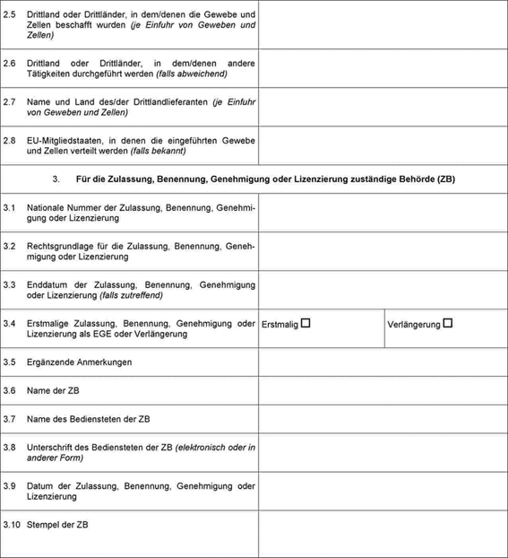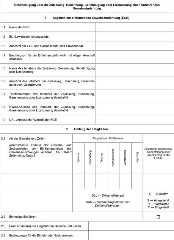 (6) Das Bundesamt für Sicherheit im Gesundheitswesen hat einer Gewebebank, die (auch) eine Bewilligung für die Einfuhr aus Drittstaaten erhalten hat, eine Bescheinigung gemäß Anhang C auszustellen.