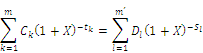 e) Mathematisch darstellen lässt sich diese Gleichung durch eine einzige Summation unter Verwendung des Faktors „Ströme“ (Ak), die entweder positiv oder negativ sind, je nachdem, ob sie für Auszahlungen oder für Rückzahlungen innerhalb der Perioden 1 bis k, ausgedrückt in Jahren, stehen: