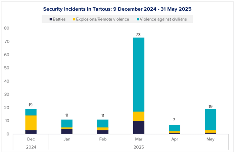 Zwischen dem 9. Dezember 2024 und dem 31. Mai 2025 verzeichnete ACLED 140 Sicherheitsvorfälle in der Provinz Tartus (siehe Abbildung 17). Für den Zeitraum zwischen dem 1. März und dem 31. Mai 2025 verzeichnete ACLED 99 Sicherheitsvorfälle (definiert als Kämpfe, Explosionen/Ferngewalt, Gewalt gegen Zivilisten) in der Provinz Tartus. Davon wurden 12 als Kämpfe, 10 als Explosionen/Ferngewalt und 77 als Gewalttaten gegen Zivilisten kodiert. Die Zahl der Sicherheitsvorfälle in der gesamten Provinz erreichte im März mit 73 Vorfällen ihren Höhepunkt und sank anschließend im April und Mai auf weniger als 20 Vorfälle pro Monat.