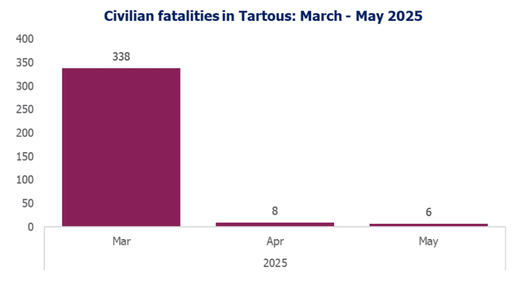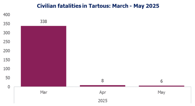 Im März 2025 verzeichnete das SNHR 338 zivile Todesopfer in der Provinz Tartus und weitere 339 zivile Opfer, die an nicht näher bezeichneten Orten in der Küstenregion ums Leben kamen. Nach Latakia war Tartus die Provinz mit der zweithöchsten Zahl an zivilen Todesopfern in diesem Monat, was etwa 22 % der Gesamtzahl (1 562) entspricht, die in alle Provinzen. Die Zahl der zivilen Todesopfer ging dann deutlich zurück, auf 8 im April und 6 im Mai.1155 Die SNHR machte für die meisten der von ihr in diesem Dreimonatszeitraum registrierten zivilen Todesfälle die an den Sicherheitsmaßnahmen in der Küstenregion beteiligten Streitkräfte (291 Todesfälle, alle im März) und nichtstaatliche bewaffnete Gruppen mit Verbindungen zur ehemaligen Assad-Regierung (38 Todesfälle, alle im März) verantwortlich. Die SNHR macht keine näheren Angaben zu diesen Todesfällen. Für den Zeitraum zwischen März und Mai 2025 verzeichnete UCDP 171 zivile Todesfälle in der Provinz Tartus.