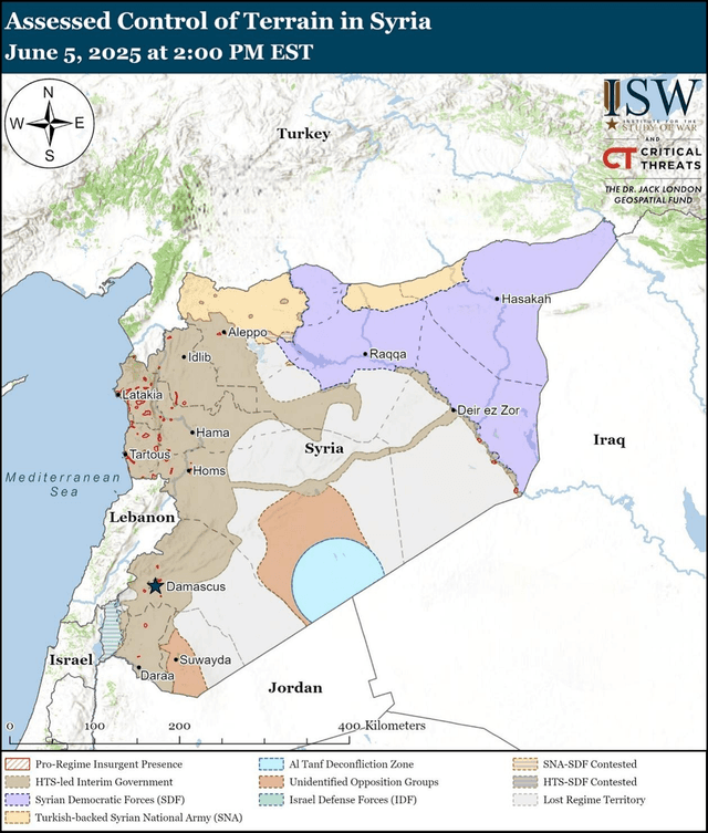 Die Feststellung zur Kontrolle in der Herkunftsregion des BF gründen sich auf die Übersichtskarte und den Ausführungen im aktuellen Länderinformationsblatt (LIB Seite 12f, 22f) und der damit übereinstimmenden, vom Institute for the study of war (ISW) erstellten Übersichtskarte vom 05.06.2025, die sowohl im Bericht Syria: Country Focus der EUAA von Juli 2025 übernommen (Seite 85) als auch im Internet (https://www.understandingwar.org/backgrounder/iran-update-june-5-2025; abgerufen am 23.10.2025) abrufbar ist. Diese Karten stellen, wie eine Einsicht in die Websites des „Carter Center“ sowie syria.liveuamap veröffentlichten Übersichtskarten zeigte, den nach wie vor aktuellen Stand dar (https://www.cartercenter.org/news/multimedia/map/exploring-historical-control-in-syria.html; Stand 01.10.2025; https://syria.liveuamap.com/; jeweils abgerufen am 23.10.2025), wobei nunmehr die Kontrolle in der Region von der syrischen Übergangsregierung ausgeübt wird, weshalb die Feststellungen dementsprechend zu treffen waren.