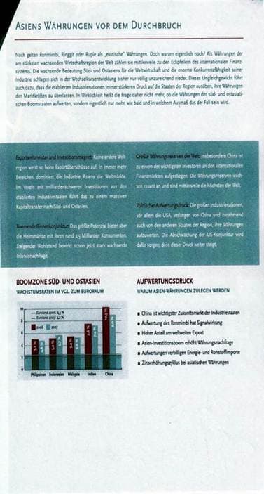 Die den Klägern von der Beraterin übergebene Werbebroschüre (vier Seiten im Format A4) beschreibt unter der Überschrift „Asiens Währungen vor dem Durchbruch“ die Kursentwicklung der für das beworbene Zertifikat maßgeblichen asiatischen Währungen und verweist auf die wachsende Bedeutung Süd- und Ostasiens für die Weltwirtschaft, die hohen Exportüberschüsse, die boomende Binnenkonjunktur, die großen Währungsreserven (insbesondere Chinas) sowie den politischen Aufwertungsdruck. Die Wachstumsraten der betreffenden Länder sind im Vergleich zum Euro-Raum grafisch dargestellt und Gründe aufgezählt, warum mit einer Aufwertung der im Währungskorb vertretenen Währungen zu rechnen sei. Unter der Überschrift „enormes Potential und 100%ige Sicherheit“ wird erläutert, dass der Anleger während der Laufzeit des Papiers im Ausmaß von 200 % an der Aufwertung des Währungskorbs teilnimmt, dass die Rückzahlung des gesamten eingesetzten Kapitals garantiert wird („100 Prozent Kapitalgarantie“), dass die Laufzeit vier Jahre beträgt und das Produkt „in Partnerschaft mit Lehman Brothers, einem der weltweit führenden Anbieter für strukturierte Währungsprodukte mit spezieller Expertise für den asiatischen Raum begeben“ wird. Die Kapitalgarantie wird dahin näher erläutert, dass es trotz des hohen Ertragspotentials für den Anleger kein Verlustrisiko gebe, weil eine Garantie für das gesamte eingesetzte Kapital vorhanden sei. Auch wenn der Währungskorb abgewertet werden sollte, erhalte der Anleger den vollen Kapitaleinsatz zurück. Unter der Zwischenüberschrift „Große Chancen, kein Risiko“ werden die Vorteile des Produkts unter Hinweis auf 13,38 % pa historische Rendite auf Basis einer Rückrechnung für alle vier Jahresperioden von 1992 bis 2006 mit den Schlagworten: „Basket der attraktivsten asiatischen Währungen, 100% Kapitalgarantie, hohe Performancepartizipation, kurze Laufzeit und Referenzwährung EUR“ zusammengefasst. Daneben wird unter der Überschrift „Eckdaten“ die Emittentin Lehman Brothers Treasury Co. BV genannt und auf deren Rating A1/A+/A+ (dies entspricht offenbar den Bewertungen der führenden Rating-Agenturen Moody's, S P und Fitch, vgl Baum aaO FN 1) verwiesen. Die Wertpapierart wird mit „Zertifikat mit Kapitalgarantie“ beschrieben, die vierjährige Laufzeit beginnend ab 5. 12. 2006 datumsmäßig angeführt sowie Emissionskurs (100 % zuzüglich 5 % Agio), Basiswert (näher beschriebener asiatischer Währungskorb), Partizipation (200 %), Stückelung (1.000 EUR) und die Orte der Börsennotiz (Luxemburg und Frankfurt) ausgewiesen. Die Werbebroschüre enthält keinen Hinweis auf die Person der Garantin (eine andere Gesellschaft der Lehmann-Gruppe).