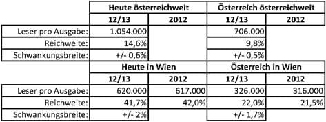 Beide Zeitungen werden in der ÖAK und der Media Analyse ausgewiesen. Die ÖAK hat folgende Jahresschnitte 2013 und 2012 und folgende Halbjahreszahlen erhoben: