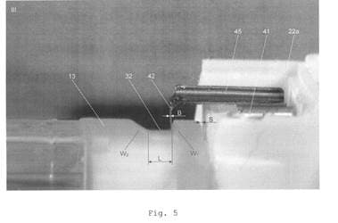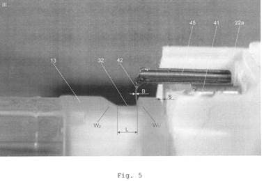Bei Betrachtung etwa von Fig 103 des Streitpatents erkennt man, dass der Vorsprung 42 nur proximal an der Ausnehmung 32 anliegt. Zum distalen Rand der Ausnehmung 32 besteht ein deutlicher Spalt. Die proximale Innenwand der Ausnehmung 32, welche W1 beim Eingriffsgegenstand entspricht, ist durch einen etwas schräg nach innen stehenden Flansch 301 gebildet, an dem sich das proximale Ende des Vorsprungs 42 abstützt. Die distale Innenwand der Ausnehmung ist genau in der selben Weise abgeschrägt wie die distale Innenwand W2 beim Eingriffsgegenstand, sodass dort eine Haltefunktion nicht möglich ist. Davon, dass das Streitpatent eine beidseitige Haltefunktion vorsieht, kann daher keine Rede sein. Dies geht weder aus der Formulierung des englischen Anspruchs noch aus den Figuren hervor.