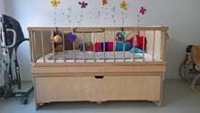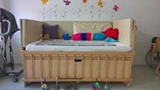 Das Gitter an der Bewegungsfläche wird geschlossen, wenn sich gerade keine Betreuungspersonen oder Therapeuten konkret mit der Bewohnerin befassen; diese beschäftigt sich dann mit verschiedensten „Greiflingen“. Die Mutter hatte bereits zuvor zu Hause eine solche – etwas kleinere – Bewegungsfläche für die Betreuung der Bewohnerin errichten lassen. Davor war sie zu Hause in einem normal großen Bett mit Seitengitter und Pölstern rund um das Bett gelagert und von ihrer Mutter immer wieder auf eine am Boden liegende Therapiematte herausgelegt worden.