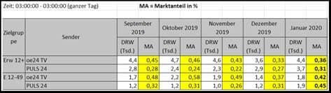 [4] Die Arbeitsgemeinschaft TELETEST publiziert die in ihrem Auftrag erhobenen Einschaltquoten im österreichischen Fernsehmarkt. Dabei werden die Marktanteile der TV-Sender ua für die Zielgruppen Erw 12+ (Personen älter als 12 Jahre) und E 12–49 (Personen von 12 bis 49 Jahren) ermittelt. Bei der Quotenmessung erfolgt jede Bezugnahme auf eine Zielgruppe jeweils mit Angabe des Alterskorridors. Die – hier relevanten – Marktanteile für die Monate September 2019 bis Jänner 2020 waren: