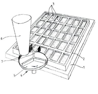 [Einzige Figur: eine perspektivische Ansicht eines Formbrettes mit einer Form mit Betonsteinen und einer Aufbringvorrichtung.]