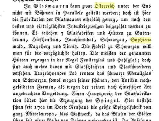 «Die venezianische Glaskunst hatte großen Einfluss auf den südlichen Teil Österreichs. Für das Waldviertel war jedoch die böhmische Glasindustrie besonders wichtig, die sich im 14. Jhdt. rasch entwickelte. Zur Glaserzeugung wurde in Böhmen – anders als in Venedig – Pottasche verwendet, wodurch das Glas stabiler wurde und geschliffen bzw. geschnitten werden konnte.