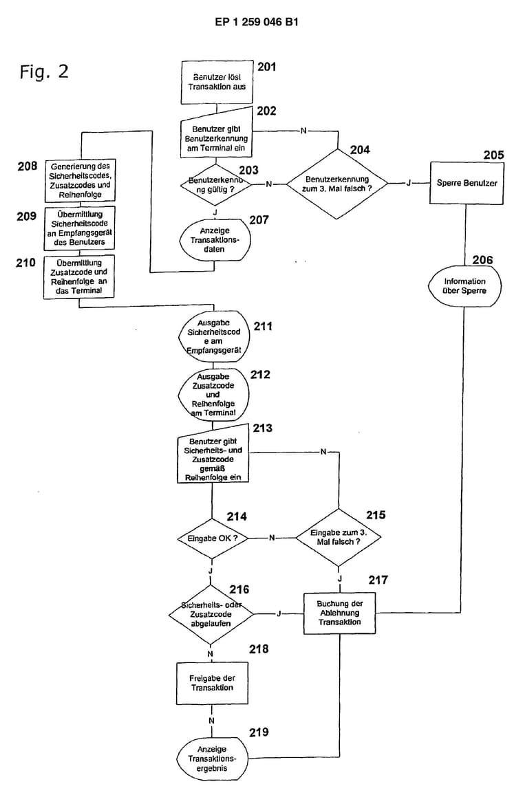 «1. Anlage für die sichere Durchführung von Transaktionen zwischen informationsverarbeitenden Systemen mit einem Terminal (102), das zur Eingabe einer Benutzerkennung dient, mit einer Auswerteeinheit (106), die mit dem Terminal (102) überein primäres Netz (101) verbunden ist, und im Wesentlichen aus einer Speicher- und Prozessoreinheit besteht, welche zur Speicherung von Benutzerstammdaten und laufenden Transaktionsdaten dient, mit einem Codegenerator, der einen Sicherheitscode erzeugt, mit einer Sendeeinrichtung, die den Sicherheitscode über ein sekundäres Netz (107) an ein Empfangsgerät (108) sendet, und mit einer Eingabemöglichkeit für den Sicherheitscode am Terminal und einer Überprüfung des eingegebenen Sicherheitscodes auf Gültigkeit durch die Auswerteeinheit (106), wobei die Auswerteeinheit (106) einen zusätzlichen Codegenerator zur Erstellung eines Zusatzcodes aufweist und eine zusätzliche Sendeeinrichtung zur Übermittlung des Zusatzcodes über das primäre Netz (101) an das Terminal (102) und zur Ausgabe des Zusatzcodes aufweist, wobei das Terminal neben der Eingabemöglichkeit des Sicherheitscodes eine Ausgabe- und Eingabemöglichkeit für den Zusatzcode aufweist und die Auswerteeinheit (106) derart ausgestaltet ist, dass diese den eingegebenen Zusatzcode überprüft und bei Gültigkeit von eingegebenen Sicherheitscode und Zusatzcode die Transaktion autorisiert, dadurch gekennzeichnet, dass die Auswerteeinheit (106) einen weiteren Generator beinhaltet, der eine Eingabereihenfolge des Sicherheitscode, des Zusatzcode und gegebenenfalls von weiteren Identifizierungsmerkmalen für die Eingabe in das Terminal generiert und dass die Auswerteeinheit (106) eine Sendeeinrichtung zur Übermittlung der Eingabereihenfolge an das Terminal (102) aufweist und dass das Terminal (102) eine Eingabemöglichkeit für den Sicherheitscode, den Zusatzcode und gegebenenfalls weitere Identifizierungsmerkmale in der vom Generator generierten Reihenfolge durch den Benutzer aufweist.