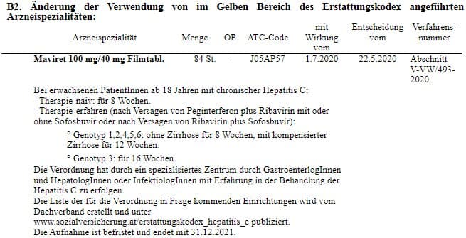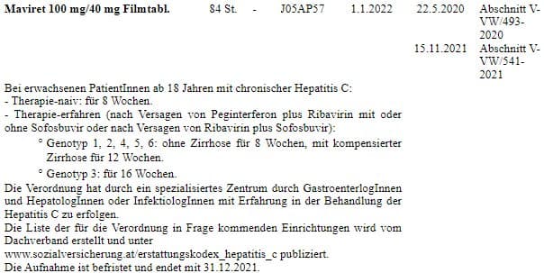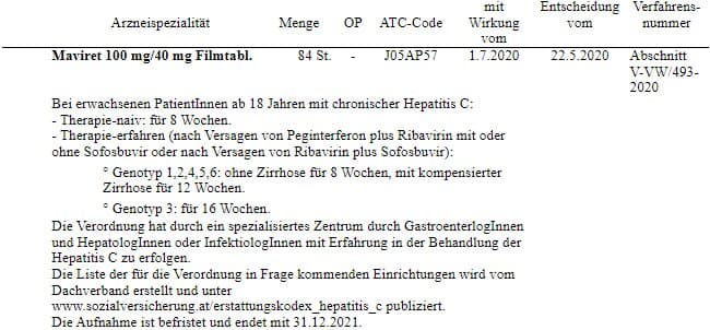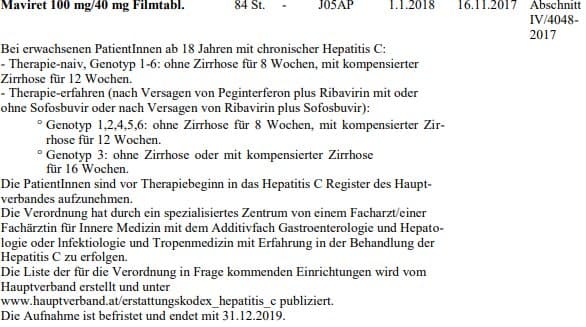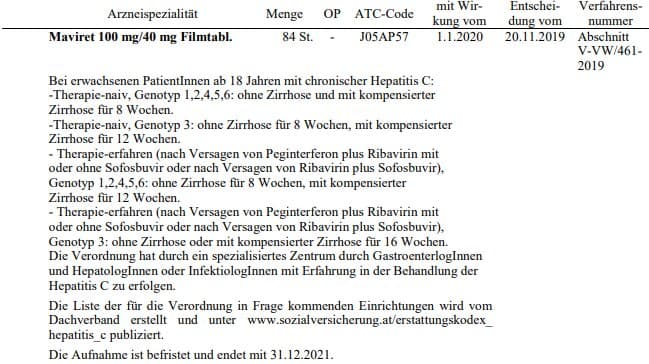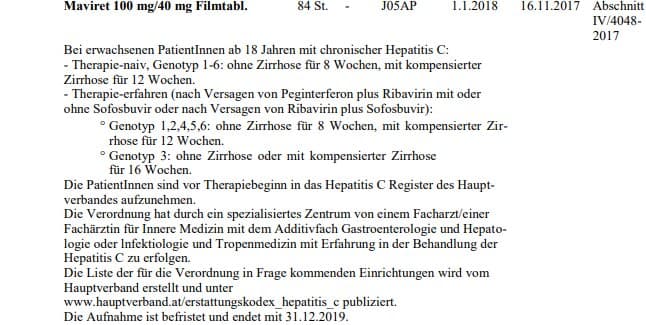 'Die befristete Aufnahme von 2 Jahren ergab sich aus der mangelnden Evidenz und Datenlage für Österreich. Zu diesem Zeitpunkt lagen keine Studiendaten von Maviret®, bezüglich der Wirksamkeit (SVR-12 Raten) und Sicherheit, auch in der tatsächlichen Behandlungspraxis ("real-life") vor.'